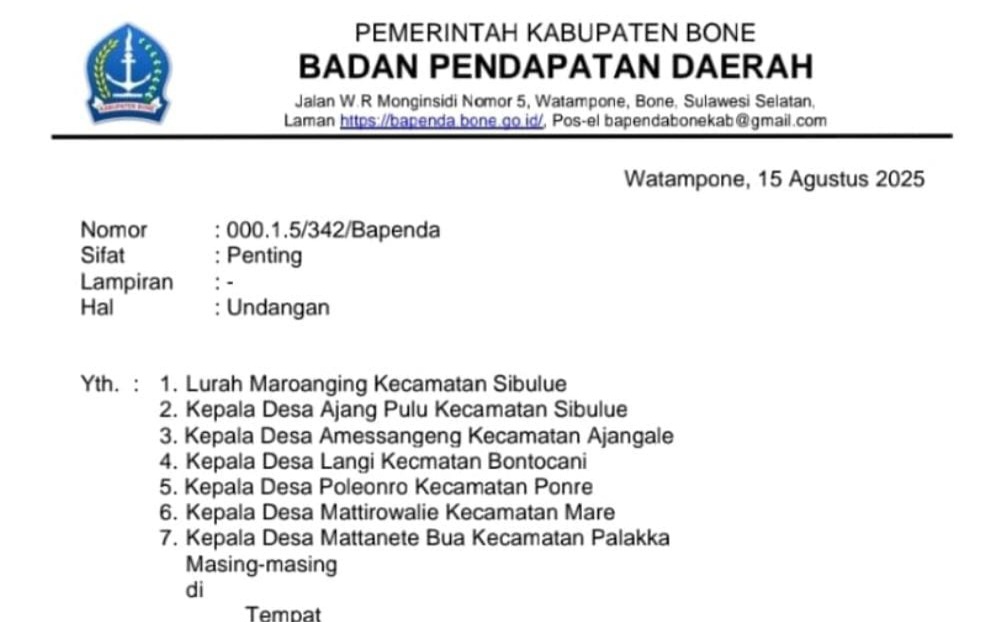 ANALISA.CO.ID, BONE 》Badan Pendapatan Daerah (Bapenda) Kabupaten Bone akan memberikan penghargaan kepada 6 kepala desa dan 1 lurah atas pelunasan Pajak Bumi Bangunan Perkotaan Perdesaan (PBB-P2). Pembweian penghargaan itu akan digelar saat gelaran HUT ke-18 RI besok, Ahad 17 Agustus 2025.